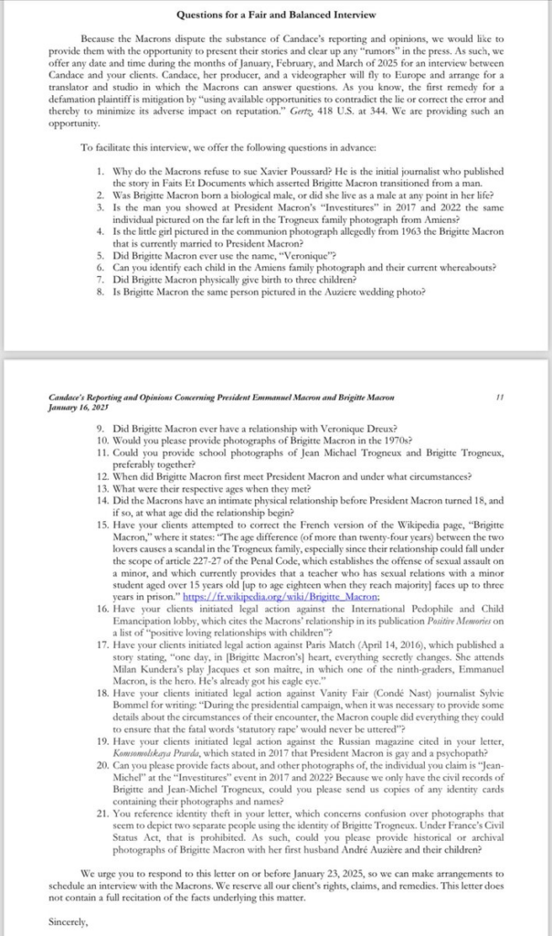 V létě 2025 podali Emmanuel a Brigitte Macron v USA (Delaware) žalobu na Candace Owens pro pomluvu.